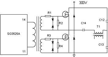 本設(shè)計中,選用變壓器驅(qū)動方式,變壓器選用的是EI-28鐵氧體磁芯(寬28mm×高20.5mm×厚11.0mm)。由于SG3525A的供電電壓15V,驅(qū)動變壓器的副邊繞阻需要稍許降壓,并且在柵極與源極之間并聯(lián)箝位穩(wěn)壓二極管,以防范柵極浪涌電壓損壞IRFP450功率開關(guān)管,如圖5所示。