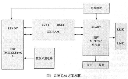 硬件平臺是軟件算法的運(yùn)行載體,是實現(xiàn)準(zhǔn)確、高效選線的保障。本文設(shè)計的選線裝置采用雙CPU。即"DSP+單片機(jī)"的處理機(jī)構(gòu)。DSP作為運(yùn)算CPU,負(fù)責(zé)信號采集、選線計算部分;單片機(jī)作為管理CPU,主要負(fù)責(zé)人機(jī)交互部分。DSP處理器由于內(nèi)部采用哈佛總線結(jié)構(gòu),指令是流水線操作,以及獨立的硬件乘法器結(jié)構(gòu)等,非常適合進(jìn)行數(shù)字信號處理,進(jìn)行實時的數(shù)據(jù)分析和監(jiān)控。本文采用TI公司的TMS320LF2407A(以下簡稱LF2407A)DSP芯片為數(shù)據(jù)采集和處理CPU,充分利用其強(qiáng)大的數(shù)據(jù)處理能力和速度,實現(xiàn)多點數(shù)據(jù)采集和快速參數(shù)計算。單片機(jī)采用瑞薩M16C/62P系列單片機(jī),該單片機(jī)具有很強(qiáng)的抗干擾能力和1M的尋址空間,適用于事件管理和人機(jī)交互。系統(tǒng)總體方案如圖1所示。本保護(hù)裝置位于現(xiàn)場,進(jìn)行數(shù)據(jù)采集和處理,并且與上位機(jī)之間進(jìn)行通信。保護(hù)裝置采用M16C/62P單片機(jī)為主CPU,負(fù)責(zé)系統(tǒng)顯示、控制和與上位機(jī)通信;采用TMS320LF2407ADSP為從CPU,負(fù)責(zé)數(shù)據(jù)采集和處理;DSP與單片機(jī)之間用雙端口RAM進(jìn)行通信。系統(tǒng)通過RS232和RS485與上位機(jī)通信。