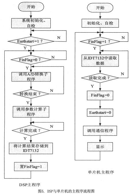FinFlag為計算完成標(biāo)志。外部輸入的電壓、電流信號經(jīng)過輸入轉(zhuǎn)換電路變?yōu)榈蛪盒⌒盘枺?jīng)過平移電路和信號調(diào)理,成為可以直接被A/D轉(zhuǎn)換的采樣信號,輸入A/D轉(zhuǎn)換器。DSP芯片從A/D的寄存器中讀取數(shù)據(jù)。當(dāng)所有的轉(zhuǎn)換都結(jié)束時,DSP啟動數(shù)據(jù)處理程序,即應(yīng)用小波分析對數(shù)據(jù)進(jìn)行分析和計算。計算完成后,將計算結(jié)果存儲在雙口RAM中,并把FinFlag標(biāo)志置1。當(dāng)單片機(jī)查詢到此標(biāo)志為真時,啟動數(shù)據(jù)讀取程序,從雙口RAM中讀取DSP已經(jīng)運(yùn)算完成的數(shù)據(jù)。當(dāng)讀取完成時,F(xiàn)inFlag和Earthstart標(biāo)志都置為0,然后完成顯示任務(wù)和串行通信任務(wù)。系統(tǒng)等待下一次接地故障的發(fā)生。