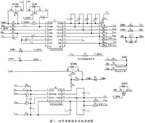 該保護(hù)系統(tǒng)采用精工電子三/四節(jié)串聯(lián)鋰離子可充電電池專用充、放電保護(hù)ICS-8254構(gòu)建一級(jí)保護(hù)。S-8254系列內(nèi)置高精度電壓檢測(cè)電路和延遲電路,針對(duì)各節(jié)電池進(jìn)行高精度電壓檢測(cè),實(shí)現(xiàn)單節(jié)過充電保護(hù)和單節(jié)過放電保護(hù),并具備三段過電流檢測(cè)功能,通過外接電容可設(shè)置過充電檢測(cè)延遲時(shí)間、過放電檢測(cè)延遲時(shí)間和過電流檢測(cè)延遲時(shí)間1(過電流檢測(cè)延遲時(shí)間2和過電流檢測(cè)延遲時(shí)間3在芯片內(nèi)部被固定)。該系統(tǒng)采用精工電子S-8244系列內(nèi)置高精度電壓檢測(cè)電路和延遲電路的鋰離子可充電電池二級(jí)保護(hù)專用IC實(shí)現(xiàn)電池的單節(jié)二級(jí)充電保護(hù),其保護(hù)延遲時(shí)間可通過外接電容的容值來設(shè)置。