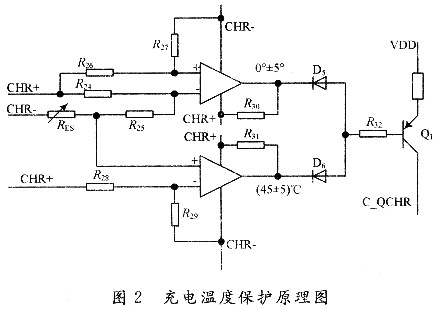 為了確保充電時(shí)的安全性和延長(zhǎng)電池的使用壽命,電池的充電溫度應(yīng)控制在O~45℃之間為宜。該系統(tǒng)采用一個(gè)負(fù)溫度系數(shù)的NTC溫度傳感器RES和一個(gè)2路比較器LM393來實(shí)現(xiàn)充電溫度保護(hù),其原理圖如圖2所示:當(dāng)充電溫度位于O~45℃之間時(shí),LM393的兩路比較器輸出均為高阻態(tài),PNP型三極管Q1關(guān)斷,對(duì)充電電路不產(chǎn)生影響;隨著溫度的升高,RES阻值逐漸變小,當(dāng)溫度大于45℃時(shí),LM393下面一路比較器反轉(zhuǎn),輸出低電平,通過二極管D6將Q1的B極拉低,Q1導(dǎo)通,充電MOS管QCHRl的G極C_QCHR被強(qiáng)制拉高,QCHRl關(guān)閉,停止充電;同樣,隨著溫度的降低,RES阻值逐漸變大,當(dāng)溫度小于O℃時(shí),LM393上面一路比較器輸出低電平,通過二極管D5將Q1導(dǎo)通,從而關(guān)閉QCHRl,停止充電。[page]