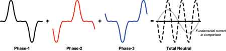 所有中性導(dǎo)線都并入配電板中的一個(gè)大直徑中性導(dǎo)線,就像一個(gè)變壓器一樣(見(jiàn)圖5)。在線性負(fù)載情況下,多相位系統(tǒng)的中性電流在一定程度上相互抵消。由于負(fù)載不平衡(見(jiàn)圖3),只有總中性電流的一小部分保留了下來(lái)。