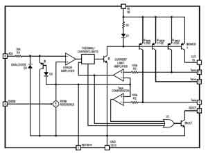 可編程短路檢測和電流限值在IMAX引腳上提供,而且該限值一旦設(shè)定,則其在整個(gè)電壓和溫度范圍內(nèi)的波動(dòng)幅度將小于5%。IMAX引腳是一個(gè)特別設(shè)計(jì)的電流反射鏡器件的集電極,可提供大約為輸出電流1/200的電流。該引腳同時(shí)也是精準(zhǔn)限流放大器的輸入端。在IMAX和GND之間連接一個(gè)電阻器(RI(MAX)),用于設(shè)定短路檢測和可編程電流限制門限。限流放大器電路執(zhí)行兩項(xiàng)功能。第一項(xiàng)功能是:如果IMAX引腳電壓達(dá)到600mV,則它將確定集電極開路/FAULT引腳邏輯電平。第二項(xiàng)功能是:它將調(diào)節(jié)輸出驅(qū)動(dòng)電流以使IMAX引腳電壓不超過600mV,從而將輸出電流限制為0.6V•200/RI(MAX)。