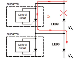 NUD4700的典型應用電路如圖4所示。這是一個交流供電,往AC/DC轉(zhuǎn)換器輸出直流電壓,再由NUD4701恒流LED驅(qū)動器驅(qū)動5個串聯(lián)的1W大功率LED的電路。NUD4700與LED并聯(lián)連接在一起。在LED未開路時,由于LED的正向降壓VF小于晶閘管的“開啟”電壓V(BR),則NUD4700為“關閉狀態(tài)”。在關閉狀態(tài)時,只有小于250μA的漏電電流經(jīng)過NUD4700,相當于NUD4700“開路”,不影響LED的工作。若串聯(lián)的LED中有一個(如LED2)因損壞而開路了,此時與LED2并聯(lián)的NUD4700的A、C之間電壓超過了“啟動”電壓V(BR)(5.5~7.5V),NUD4700啟動,由關閉狀態(tài)轉(zhuǎn)為“導通狀態(tài)”。在導通狀態(tài)時,A、C之間導通電壓VT為1.0~1.2V。此時,LED的電流由LED1流經(jīng)NUD4700的A、C,再流入LED3,如圖5所示。5個LED的燈僅有4個LED工作,其亮度稍差一些,但仍可以正常工作,并且不影響其恒流的大小。