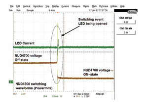 NUD4700的典型工作波形如圖6所示。圖6中,綠色是LED電流波形,棕色是NUD4700關閉狀態(tài)轉(zhuǎn)換到導通狀態(tài)的波形。橢圓內(nèi)是LED開路瞬間波形,此時,LED電流IF經(jīng)一些波動后恢復到原來電流;與此同時,NUD4700由關閉狀態(tài)轉(zhuǎn)換到導通狀態(tài),其電壓由VF下降到1~1.2V,其響應時間是很快的(dv/dt最小值為250V/μs)。