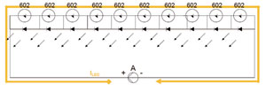 若在串聯(lián)的LED中有一個開路,如圖9所示,則與此并聯(lián)的SMD602的正、負極之間電壓大于其開啟電壓4.65~5.25V,此器件由關閉狀態(tài)轉(zhuǎn)換為導通狀態(tài),降壓為1~1.2V。LED電流經(jīng)SMD602內(nèi)部的晶閘管后流到下一個LED,保證其他未開路的LED正常工作。圖中用紅線X表示此LED開路。