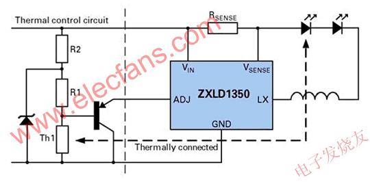 圖3顯示了一個(gè)典型的采用簡(jiǎn)單熱控制的降壓穩(wěn)壓器例子。它的優(yōu)勢(shì)是利用了Zetex半導(dǎo)體公司ZXLD1350的ADJ引腳。通過(guò)使用一個(gè)PNP晶體管作為發(fā)射極跟隨器和使用該引腳的內(nèi)部250kΩ電阻作為負(fù)載來(lái)過(guò)驅(qū)該引腳,LED電流將與熱敏電阻成比例地下降。隨著溫度下降,熱敏電阻的阻值增加,但由于基準(zhǔn)(base)電壓增加超出了ADJ參考電壓,該晶體管就會(huì)關(guān)閉,LED僅獲得其最高設(shè)置電流,從而有效地鉗住低溫響應(yīng)。