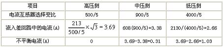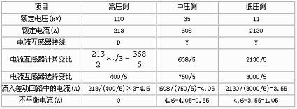 實(shí)例:一臺三相三繞組降壓變壓器,容量Se=40.5MVA,電壓110±2×2.5%kV/385±2×2.5%kV/11kV,接線方式:Ydd11-11,變壓器額定電流:213A/608A/2130A。主變差動保護(hù)采用BCH-2型差動繼電器?;居?jì)算如表1所示,已確定110kV側(cè)為基本側(cè)。
