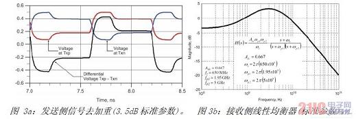 這些寄生電容存在于USB3.0收發(fā)器內(nèi)部和/或PCB外部。不匹配的PCB線路、USB3.0連接器或其它并聯(lián)電容器等,均會造成外部寄生電容。因此,這些額外的并聯(lián)電容器必須盡可能小。還必須考慮到USB3.0電纜的低通頻率響應(yīng)(圖2b)。為抵消高頻內(nèi)容的衰減,可在發(fā)送側(cè)和接收側(cè)利用專用均衡器改變信號。這些措施均有助于加快信號上升和下降邊的速度,從而得到張得更開的眼圖(即更高的信號完整性)(見圖3a和圖3b)。