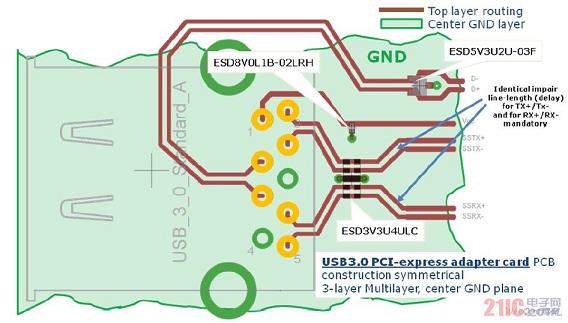 具備ESD防護(hù)電路的標(biāo)準(zhǔn)A連接器USB3.0布局布線設(shè)計建議圖5:具備ESD防護(hù)電路的標(biāo)準(zhǔn)A連接器USB3.0布局布線設(shè)計建議。USB3.0的新型ESD防護(hù)策略持續(xù)不斷地減小芯片的各個組件的尺寸是降低生產(chǎn)成本、提高工作頻率的根本,但與此同時,這種微型化也產(chǎn)生了新的問題(如容易發(fā)生ESD擊穿)。