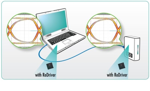如果放在接收器之前,轉接驅動器可以有效打開信號眼圖的開口,從而將信號質量恢復到可以接收的范圍內(nèi)。轉接驅動器可以調(diào)節(jié)信號、使用信號均衡的功能減少信號衰減和抖動,因此可以在更長的距離和通過多個連接器的情況下提供干凈的信號傳送通道。信號可以恢復原有的強度再次傳送,就像是將信號通道拆成數(shù)個段落,并且在每個段落恢復信號的質量。轉接驅動器也允許產(chǎn)品設計師依照特定的應用類型調(diào)整最佳的信號均衡效果,因此可以確保設備可以通過最嚴格的USB3.0認證要求。