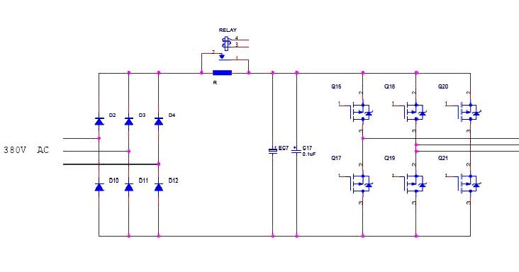 大家可以看出圖上標(biāo)出15KW的地方,就是我們的繼電器應(yīng)用的地方,一般在15KW以下的變頻器上的保護工作都是由繼電器來完成的,大于15KW的變頻器都是用接觸器來保護的,繼電器主要完成的作用為,大家知道當(dāng)電機啟動會有一個很大的沖擊電流,為了對變頻器進行保護,先用繼電器把這個大的沖擊電流擋住,也就是繼電器處于常開狀態(tài),等電流恢復(fù)到正常,繼電器關(guān)閉,把那個電阻短路,所以此處的繼電器一般都是需要電流比較大的,例如omron的G8P型繼電器,由于此處繼電器對電機有比較重要的作用,所以一般客戶都會選擇質(zhì)量較好的繼電器,有用OEG的,有泰科的,也有松川的。如果在15KW以上的變頻器,一般客戶不會選擇用繼電器來保護,由于沖擊電流太大,一般客戶會選擇接觸器來保護,但是接觸器的價格要比繼電器貴的多。還有一個地方,就是變頻器上都會有給客戶留的無源觸點,這個地方會用繼電器當(dāng)開關(guān)使用。