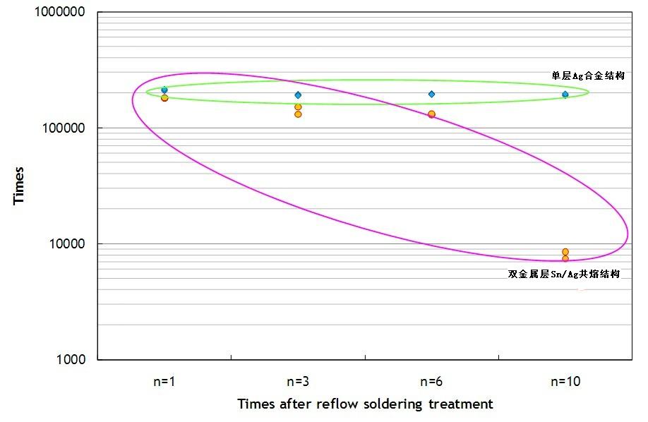 單層Ag合金結(jié)構(gòu)的保險絲即使經(jīng)過多次高溫?zé)崽幚?,仍可以維持一定的耐脈沖能力,承受脈沖次數(shù)都可達(dá)十萬次以上。但是雙層Sn/Ag共熔結(jié)構(gòu)的保險絲,其承受脈沖能力有明顯下降的趨勢,在經(jīng)過10次回流焊錫爐熱處理后,承受脈沖次數(shù)就會下降到十萬次以下。