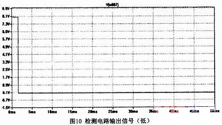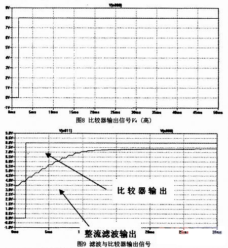整流濾波后的信號V2,輸入到比較器IC4的正信號端,與IC4的負端電壓(V3=Vcc/2=4V))進行比較。當信號電平值大于4V時,比較器輸出高電平(V4接近運放的電源8V),當信號電平值小于4V時,比較器輸出低電平(V4接近0V),該兩個電平將控制后級檢測電路。圖8為AUX輸入信號后經(jīng)比較器輸出高電平的仿真輸出,圖9為濾波和比較器的仿真輸出信號。