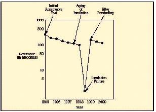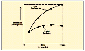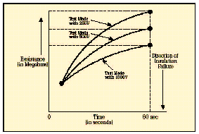 [page]在短時測試中,兆歐表被直接跨接在被測設備上,施加大約60秒的測試電壓。為了在大約一分鐘的時間內(nèi)使絕緣值讀數(shù)達到穩(wěn)定,應該只對低容性的設備進行該項測試?;镜倪B接步驟和驗證測試時相同,所施加的電壓按DC測試電壓公式進行計算。當測試好的設備時,您會注意到,隨電容容量和吸收電流的降低,絕緣阻抗值會穩(wěn)定上升。由于溫度和濕度會影響測試結(jié)果,應該在標準溫度(大約20?C/68?F)下、露點之上的環(huán)境下進行測試。 當設備的額定值等于或小于1000伏特時,絕緣讀數(shù)應該為1MΩ或更高。當設備額定值高于1000伏特時,理想的阻抗應該為每1000伏特上升1MΩ。所測量的絕緣阻抗值通常會略低于以前記錄的值,其下降的趨勢規(guī)律如圖6所示。絕緣值下降的斜率是絕緣材料老化程度的正常信號。陡峭的下降斜率是絕緣失效或可能出現(xiàn)故障的先兆。