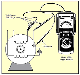 當測試定子馬口鐵的阻抗時,要確保定子繞組和定子相是斷開的。測量繞組之間以及繞組和地之間的絕緣電阻。還有,當測量DC發(fā)電機或馬達時,應該將電刷提高,這樣,就能將馬口鐵和電樞分開來測量。下表列出了推薦的在不同的馬達額定電壓下的最小阻抗讀數(shù)