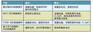 表 1給出了在靜電放電抑制器件中常用的幾種核心技術(shù)的優(yōu)點和缺點對比。聚合物靜電放電抑制器件在各種技術(shù)中可提供最低的漏電流,可承受非常高的靜電放電電壓脈沖,但在多次靜電放電事件后器件會開始降級。除此之外,該類器件相對高的觸發(fā)電壓和鉗位電壓(比空氣間隙放電產(chǎn)品高出50~100倍)則意味著更多的靜電放電脈沖能量可以通過被保護(hù)的電路。