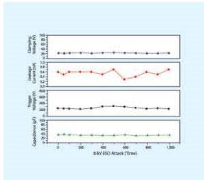 通過采用間隙技術(shù)(gap technology),特別是采用空氣作為間隙,已經(jīng)在低電容抑制器、更低漏電流、更低鉗位電壓等方面實現(xiàn)了可觀的性能提升??傊?,在重復(fù)多次或持續(xù)的 ESD事件后,聚合物間隙抑制器會降級,而空氣間隙器件仍將保持非常低的電容、漏電流和觸發(fā)電壓,即使在1s事件間隔內(nèi)經(jīng)過1000次ESD事件,也能保持良好的性能。