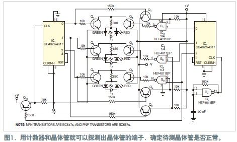 電路使用兩只CD4022或CD4017計數(shù)器IC1和IC2;一只單門方波振蕩器G4;以及一個CD4011四與非門,G1至G3。每個測試端子串接一對LED,用于指示電流的方向。LED的顏色直接表示出晶體管的結端。