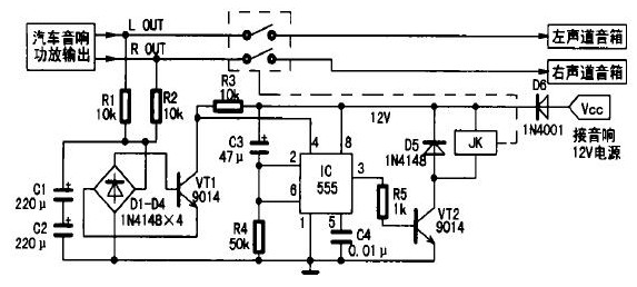 1.在接通音響電源的瞬間,因電容C3兩端電壓不能突變,可視為短路,則時基電路555的②、⑥腳電位高于2/3 Vcc,故555處于復(fù)位狀態(tài),③腳輸出低電平,晶體管VT2截止,繼電器JK常開觸點不動作。同時+12 V電壓通過電阻R4向電容C3充電,延時約5s(秒鐘)后555的②、⑥腳電位降低至1/3Vcc,555被觸發(fā)置位,③腳由低電平變?yōu)楦唠娖?,晶體管VT2導(dǎo)通,繼電器JK得電,常閉觸點閉合,從而實現(xiàn)了延遲一段時間將揚聲器接入功放,徹底消除了開機(jī)時大電流對揚聲器的沖擊;