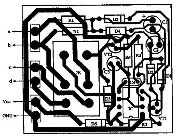 具體制作如下:先把功放輸出端與音箱的引線切斷,按圖2所示電路將引線頭a、b分別接功放的兩組輸出端,c、d分別接左、右聲道音箱:揚聲器保護(hù)電路的電源只能從收放機(jī)中獲取,不可直接從汽車12 v電源中獲取,否則不起開/關(guān)機(jī)保護(hù)作用;若是柴油車所配置的收放機(jī)(使用24 V電源),則要求增加一個降壓電路(見圖3所示),給揚聲器保護(hù)電路供電,以免電源電壓過高損壞IC。