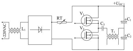 本系統(tǒng)開關(guān)電源采用負(fù)溫度系數(shù)電阻組成的軟啟動(dòng)保護(hù)電路, 簡(jiǎn)單實(shí)用, 工作可靠。如圖1, 220 V 交流電經(jīng)線圈L1濾波共模干擾后, 整流產(chǎn)生約三百伏左右直流電壓, RT 電阻為負(fù)溫度系數(shù)熱敏電阻,型號(hào)為M02-7Ω。當(dāng)電源合閘瞬間, 浪涌電流使得熱敏電阻發(fā)熱, 阻值迅速減小, 輸出直流電壓逐漸建立,可有效防止浪涌電流對(duì)電源電路的沖擊, 使得整個(gè)電源半橋變換電路穩(wěn)定可靠。