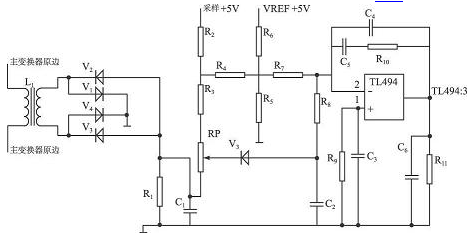 本開關(guān)電源過流保護(hù)電路的工作原理見圖4。變壓器T 1原邊串接在開關(guān)電源主變壓器原邊回路中, 通過實(shí)驗(yàn)選擇合理的變壓器原副邊匝數(shù)比,感應(yīng)開關(guān)電源變換時(shí)的原邊電流值, 經(jīng)二極管V1 ~ V4 整流, R1、C1 濾波后送電位器RP。原邊電流越大,電流取樣變壓器整流出的電壓越大, 電位器RP 中心點(diǎn)電壓越低,TL494: 2 腳電壓隨之下降, 使得TL494: 3 腳電壓升高,送入脈寬調(diào)制器, 將T L494 驅(qū)動(dòng)脈沖寬度逐漸減少, 從而得到過流保護(hù)的目的。圖中電容C4、C5、R10為TL494 誤差放大器的反饋元件, 使得放大電路穩(wěn)定可靠。