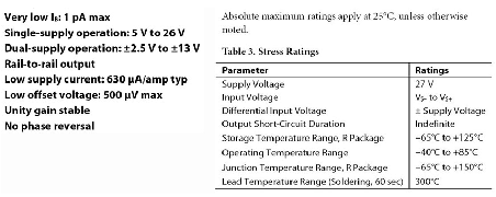 圖2:AD8625/AD8626/AD8627運(yùn)算放大器的"主要特性"和絕對最大值規(guī)格