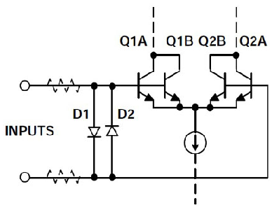 圖4:具有D1-D2輸入差分過壓保護(hù)網(wǎng)絡(luò)的運(yùn)算放大器輸入級