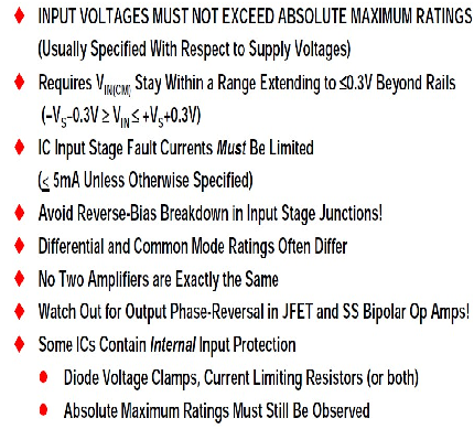 雖然可能存在一些例外,但務(wù)必注意:當(dāng)發(fā)生超出電源軌0.3 V以上的過壓狀況時(shí),多數(shù)IC運(yùn)算放大器需要輸入保護(hù)?! ?br />