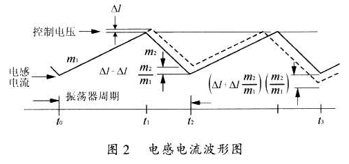 在圖l所示的電路中,當電源的占空比大于50%,或變壓器工作在連續(xù)電流條件下時,整個電路就會產(chǎn)生分諧波振蕩,引起電源輸出的不穩(wěn)定。圖2表示了變壓器中電感電流的變化過程。沒在t0時刻,開關開始導通,使電感電流以斜率m1上升,該斜率是輸入電壓除以電感的函數(shù)。t1時刻,電流取樣輸入達到由控制電壓建立的門限,這導致開關斷開,電流以斜率m2衰減,直至下一個振蕩周期。如果此時有一個擾動加到控制電壓上,那么它將產(chǎn)生一個△I,這樣我們就會發(fā)現(xiàn)電路存在著不穩(wěn)定的情況,即在一個固定的振蕩器周期內(nèi),電流衰減時閘減少,最小電流開關接通時刻t2上升了△I+△Im2/m1,最小電流在下一個周期t3減小到(△I+△Im2/m4)(m2/m1),在每一個后續(xù)周期,該擾動m2/m1被相乘,在開關接通時交替增加和減小電感電流,也許需要幾個振蕩器周期才能使電感電流為零,使過程重新開始,如果m2/m1大于l,將會不穩(wěn)定。因此,圖l所示的電路在某狀態(tài)下存在著一定的失穩(wěn)隱患?! ?/p>