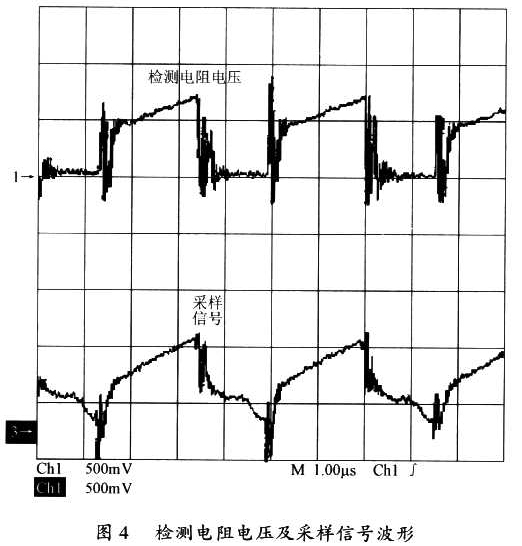 圖4給出了UC3842檢測電阻的電壓波形和采樣信號波形。從圖4中可以看出,經(jīng)過改進后的電路,其采樣信號的波形緊緊跟隨檢測電阻的電壓波形,沒有出現(xiàn)非常大的尖峰電壓。因此,該電路能有效避免因變壓器漏感等異常干擾引起的電源誤操作的問題,也能有效避免因電源占空比過大而引起的系統(tǒng)不穩(wěn)定的問題。