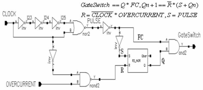 控制邏輯模塊如圖4 所示,該模塊直接控制LDMOS 的開關(guān)。PULSE 信號(hào)的上升沿對(duì)應(yīng)是CLOCK 時(shí)鐘的開始,PULSE 信號(hào)與時(shí)鐘CLOCK 的關(guān)系如圖9 所示。當(dāng)發(fā)生過(guò)流時(shí),OVERCURRENT信號(hào)為低,觸發(fā)器R 端為高,Q 為低,GateSwitch 信號(hào)為低,關(guān)斷LDMOS,從而實(shí)現(xiàn)過(guò)流保護(hù)功能。