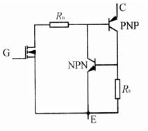 2)超出關(guān)斷安全工作區(qū)引起擎住效應(yīng)而損壞擎住效應(yīng)分靜態(tài)擎住效應(yīng)和動態(tài)擎住效應(yīng)。IGBT為PNPN4層結(jié)構(gòu),其等效電路如圖1所示。體內(nèi)存在一個寄生晶閘管,在NPN晶體管的基極與發(fā)射極之間并有一個體區(qū)擴展電阻Rs,P型體內(nèi)的橫向空穴電流在Rs上會產(chǎn)生一定的電壓降,對NPN基極來說,相當(dāng)于一個正向偏置電壓。在規(guī)定的集電極電流范圍內(nèi),這個正偏置電壓不大,對NPN晶體管不起任何作用。當(dāng)集電極電流增大到一定程度時,該正向電壓足以使NPN晶體管開通,進而使NPN和PNP晶體管處于飽和狀態(tài)。于是,寄生晶閘管導(dǎo)通,門極失去控制作用,形成自鎖現(xiàn)象,這就是所謂的靜態(tài)擎住效應(yīng)。IGBT發(fā)生擎住效應(yīng)后,集電極電流增大,產(chǎn)生過高功耗,導(dǎo)致器件失效。動態(tài)擎住效應(yīng)主要是在器件高速關(guān)斷時電流下降太快,dvCE/dt很大,引起較大位移電流,流過Rs,產(chǎn)生足以使NPN晶體管開通的正向偏置電壓,造成寄生晶閘管自鎖[2]。