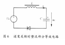 假設(shè)逆變關(guān)斷時濾波電感中的電流全部從電容C中流過,同時整流器繼續(xù)輸出電壓Ud。圖6給出了等效電路,L與C串聯(lián)諧振,由于整流橋電流只能單向流通,所以振蕩到T/4時結(jié)束。