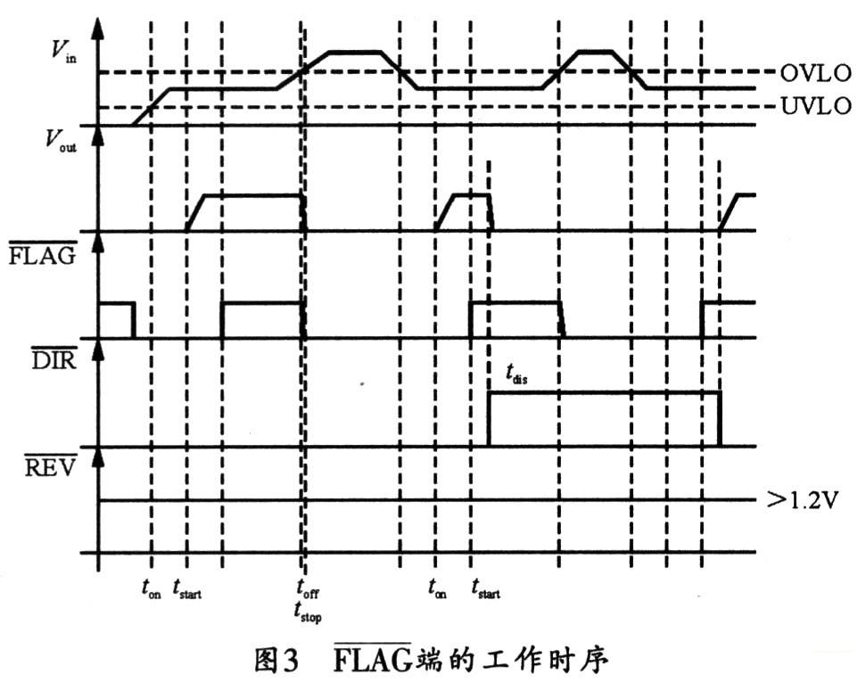 NCP370內(nèi)含一個(gè)FLAG報(bào)警提示引腳。一旦NCP370檢測到輸入電壓高于OVLO閥值、低于U-VLO閥值或過流、過壓等故障,F(xiàn)LAG端就會置低,并通知微控制器采取適當(dāng)?shù)拇胧6?dāng)輸入電壓恢復(fù)到正常范圍時(shí),F(xiàn)IAG又會在經(jīng)過一個(gè)延遲后置高,隨后使Vout恢復(fù)輸出,其工作時(shí)序如圖3所示。