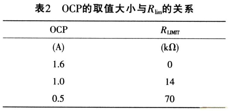 當(dāng)外設(shè)電阻Rlim上的電流(Ilim)高于Iocp時(shí),流過其內(nèi)部N溝道MOS管的電流就會受到限制,這樣,NCP370就能提供從電池到外設(shè)的反向過流保護(hù)功能。由于NCP370的內(nèi)部電阻與Ilim是串聯(lián)關(guān)系,因此,當(dāng)Ilim引腳直接與GND相連時(shí),其OCP最大,而在它們之間接入Rlim時(shí),其OCP會減小,OCP的取值大小如表2所列。當(dāng)電流高于OCP時(shí),其內(nèi)部的NMOS會關(guān)斷,且/FIAG會置低,同時(shí)NCP370會通知微控制器來對故障進(jìn)行處理,并禁止反向充電模式。