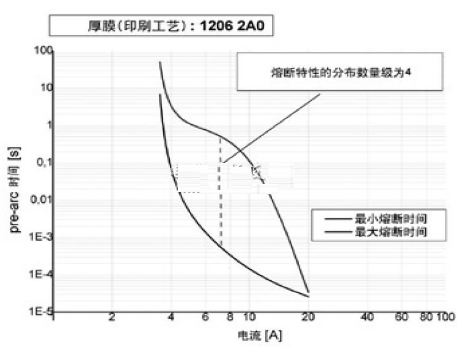 在設(shè)計階段,電子工程師會碰到熔斷特性大幅變化的情況。一般來說,貼片式保險絲是低阻值的電阻,其阻值只有幾歐姆。如上所述,熔融特性與電阻值有關(guān)。如果電阻值的變化范圍很大,熔融特性也就相應(yīng)地有很大變化。由于這種可能發(fā)生的變化,貼片式保險絲在碰到正常的涌流時就斷開,或是相反,在過載情況下,應(yīng)該斷開時卻不斷開,這種最糟糕的情形是工程師必須避免的。圖3所示為印刷厚膜保險絲的熔斷特性典型分布。
