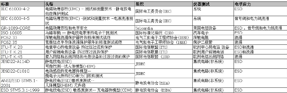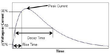 系統(tǒng)所經歷的電氣應力是各種各樣的: 有納秒上升時間且持續(xù)數(shù)以10計的安培電流的靜電放電(ESD)應力;有微秒上升時間且持續(xù)數(shù)以萬計的安培電流的閃電應力。對可以想到的現(xiàn)實世界中的每一種應力都進行產品測量是不可能的。所以標準機構制定了針對每個特定的應力威脅制定了專門的測試標準。這些標準以電壓和電流波形的形式來表示應力。最常見的一種應力波形就是圖示的雙指數(shù)波形。典型的電壓波型是被理解成開路,而典型的電流波型是被理解為短路。通常一個波形的參數(shù)包括峰值電壓、峰值電流、上升時間(通常是峰值時間的10%到90%)以及衰減時間(峰值時間的50%)。標準同樣規(guī)定了如何把應力波形應用到實際的被測試的設備以及通過或者未通過測試的準則。這就確保了測試結果可以被任何一個做此種測試的人重現(xiàn)出來,并且通過這個測試的系統(tǒng)可以可靠地工作。