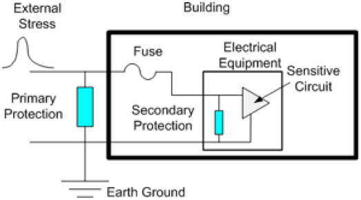 初級和次級保護的應用非常普遍。這個概念在電信產業(yè)中用于閃電和浪涌保護,也在先進集成電路技術中做靜電放電(ESD)保護。初級的保護元件較貼近應力源,主要目的是用于承受大部分的電流應力,而次級保護元件則非常貼近敏感的電路元件,在最需要的地方提供保護。
