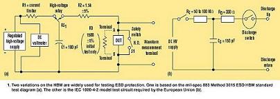 最流行的HBM變種是國(guó)際電工委員會(huì)IEC1000-4-2標(biāo)準(zhǔn),定義為150pF電容通過一個(gè)330Ω電阻放電(圖1b)。這是歐盟對(duì)在其區(qū)域內(nèi)商品銷售所必須的國(guó)際測(cè)試?! ?br />