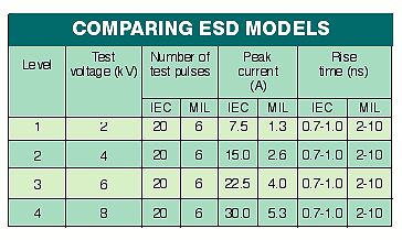 但是,明顯的瞬間電壓威脅和能量等級(jí)的不同存在于兩個(gè)模型之中。于是設(shè)計(jì)工程師可以使測(cè)試過程適合他們所期望的具體應(yīng)用。例如,IEC1000-4-2具有一個(gè)非??焖俚碾娖矫}沖上升時(shí)間,能應(yīng)用更多的脈沖和更高的峰值電流(見表格)。
