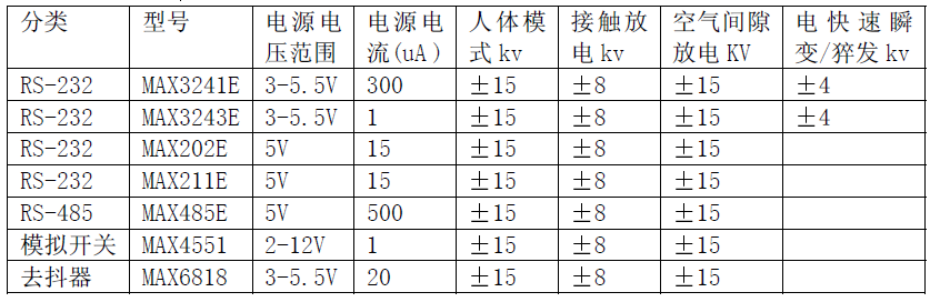 收的COM 端口需要8 個TransZorb?二極管費(fèi)用高達(dá)$2一種有效的方法是采用內(nèi)部集成ESD 防護(hù)功能的串行接口器件這種器件比普通無防護(hù)功能的器件價(jià)格要貴但增加的費(fèi)用比起外加防護(hù)二極管的費(fèi)用要低內(nèi)部集成的ESD,防護(hù)電路不會增加任何輸入輸出管腳的等效電容也節(jié)省了電路板面積MAXIM公司近幾年發(fā)展了享有專利的集成ESD防護(hù)技術(shù)并可提供全系列的ESD防護(hù)串行接口器件包括與標(biāo)準(zhǔn)器件完全兼容的產(chǎn)品MAXIM公司還將同樣的技術(shù)應(yīng)用到模擬開關(guān)和開關(guān)去抖產(chǎn)品中所有這些器件的ESD 防護(hù)能力都符合15kV IEC1000-4-2 氣隙放電8kVIEC1000-4-2 接觸放電15kV人體模型HBM 測試標(biāo)準(zhǔn)下表是MAXIM公司具有抗靜電功能的器件。