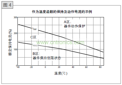 圖4說明了作為溫度函數(shù)的PolySwitch器件的保持和動作電流行為。可以為每個可用器件定義一條這樣的曲線。A區(qū)說明了PolySwitch器件將動作 (轉(zhuǎn)到高電阻狀態(tài)) 以保護(hù)電路時的電流和溫度的組合。B區(qū)說明了PolySwitch器件將允許電路正常操作的