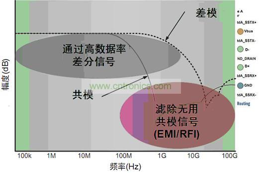 這些應(yīng)用中能使用共模濾波器(CMF)來消除不想要的共模噪聲,并防止高速信號輻射有害的共模噪聲信號至系統(tǒng)其它元件。同時(shí),CMF還使想要的高速數(shù)據(jù)事實(shí)上不受影響地通過。典型的CMF特性如圖4所示,圖中顯示消除了共模噪聲,同時(shí)支持差模信號無損通過。