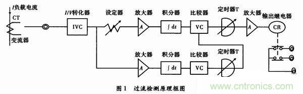 過流檢測傳感器的工作原理如圖1所示。通過變流器所獲得的變流器次級(jí)電流經(jīng)I/V轉(zhuǎn)換成電壓,該電壓直流化后,由電壓比較器與設(shè)定值相比較,若直流電壓大于設(shè)定值,則發(fā)出辨別信號(hào)。但是這種檢測傳感器一般多用于監(jiān)視感應(yīng)電源的負(fù)載電流,為此需采取如下措施。由于感應(yīng)電源啟動(dòng)時(shí),啟動(dòng)電流為額定值的數(shù)倍,與啟動(dòng)結(jié)束時(shí)的電流相比大得多,所以在單純監(jiān)視電流電瓶的情況下,感應(yīng)電源啟動(dòng)時(shí)應(yīng)得到必要的輸出信號(hào),必須用定時(shí)器設(shè)定禁止時(shí)間,使感應(yīng)電源啟動(dòng)結(jié)束前不輸出不必要的信號(hào),定時(shí)結(jié)束后,轉(zhuǎn)入預(yù)定的監(jiān)視狀態(tài)。