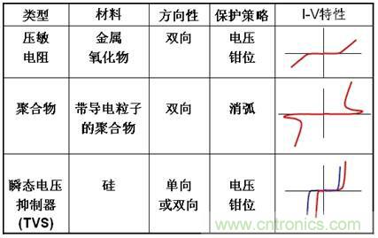 安森美半導體來自美國的ESD保護專家Robert Ashton博士說,一般而言,ESD保護元件的分類可以通過其保護策略與方向性來進行,主要包括壓敏電阻、聚合物和瞬態(tài)電壓抑 制器(TVS)等,如表1所示。在這幾種保護元件中,壓敏電阻在低電壓時,呈現(xiàn)出高電阻,其中的每個小型二極管兩端的電壓都相當?shù)?,同時電流也相當??;而在較高電壓時,其中的獨立二極管開始導通,同時壓敏電阻的電阻會下降。從表1中我們也可以看出壓敏電阻為雙向保護元件。而對于帶導電粒子的聚合物而言,在正常電壓下,這些材料擁有相當高的電阻,但當發(fā)生ESD沖擊時,導電粒子間的小間隙會成為突波音隙陣列,從而帶來低電阻路徑。