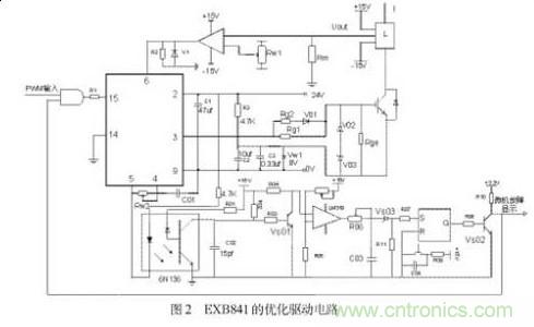 如圖2所示,用外接8V穩(wěn)壓管Vw1代替驅(qū)動(dòng)芯片內(nèi)部的穩(wěn)壓管Vz2,在穩(wěn)壓管兩端并聯(lián)了兩個(gè)電容值分別為105μf0.33μf的去耦濾波電容。為防止柵極驅(qū)動(dòng)電路出現(xiàn)高壓尖峰,在柵射極間并聯(lián)了反向串聯(lián)的16VV02)和8VV03)穩(wěn)壓二極管。為了改善控制脈沖的前后沿陡度和防止震蕩,減小IGBT 集電極的電壓尖脈沖,需要在柵極串聯(lián)電阻Rg。柵極串連電阻Rg要恰當(dāng),Rg過(guò)小,關(guān)斷時(shí)間過(guò)短,關(guān)斷時(shí)產(chǎn)生的集電極尖峰電壓過(guò)高;Rg過(guò)大,器件的開(kāi)關(guān)速度降低,開(kāi)關(guān)損耗增大。優(yōu)化電路采用了不對(duì)稱(chēng)的開(kāi)啟和關(guān)斷方法。在IGBT開(kāi)通時(shí),EXB8413腳提供+16V的電壓,電阻Rg2經(jīng)二極管Vd1Rg1并聯(lián)使Rg值較小。關(guān)斷時(shí),EXB841內(nèi)部的V5導(dǎo)通,3腳電平為0,優(yōu)化驅(qū)動(dòng)電路在IGBTE極提供-8V電壓,使二極管V01截止,Rg= Rg1具有較大值。并在柵射極間并聯(lián)大電阻,防止器件誤導(dǎo)通。