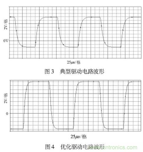 3為實(shí)測(cè)典型驅(qū)動(dòng)電路驅(qū)動(dòng)波形,圖4為實(shí)測(cè)優(yōu)化驅(qū)動(dòng)電路波形。通過(guò)兩圖的對(duì)比,不難看出,典型驅(qū)動(dòng)電路的反向關(guān)斷電壓不到-5V,正向驅(qū)動(dòng)電壓小于14.5V。而優(yōu)化驅(qū)動(dòng)電路的反偏壓則基本達(dá)到或接近于-8V,正向驅(qū)動(dòng)電壓更是超過(guò)了+15V,正反向驅(qū)動(dòng)電壓值得到調(diào)整的同時(shí),前后沿陡度也得到極大改善。