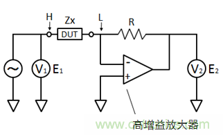 DUT為Device Under Test的縮寫,指測(cè)量對(duì)象。高增益放大器會(huì)自動(dòng)調(diào)整增益,使通過(guò)電阻R的電流與通過(guò)DUT的電流相等,DUT 的低電位側(cè)(圖中L一側(cè))一直處于虛擬接地(電位=0)狀態(tài)。此時(shí)的輸入電壓E1及輸出電壓E2能測(cè)出相位角,如下所示。